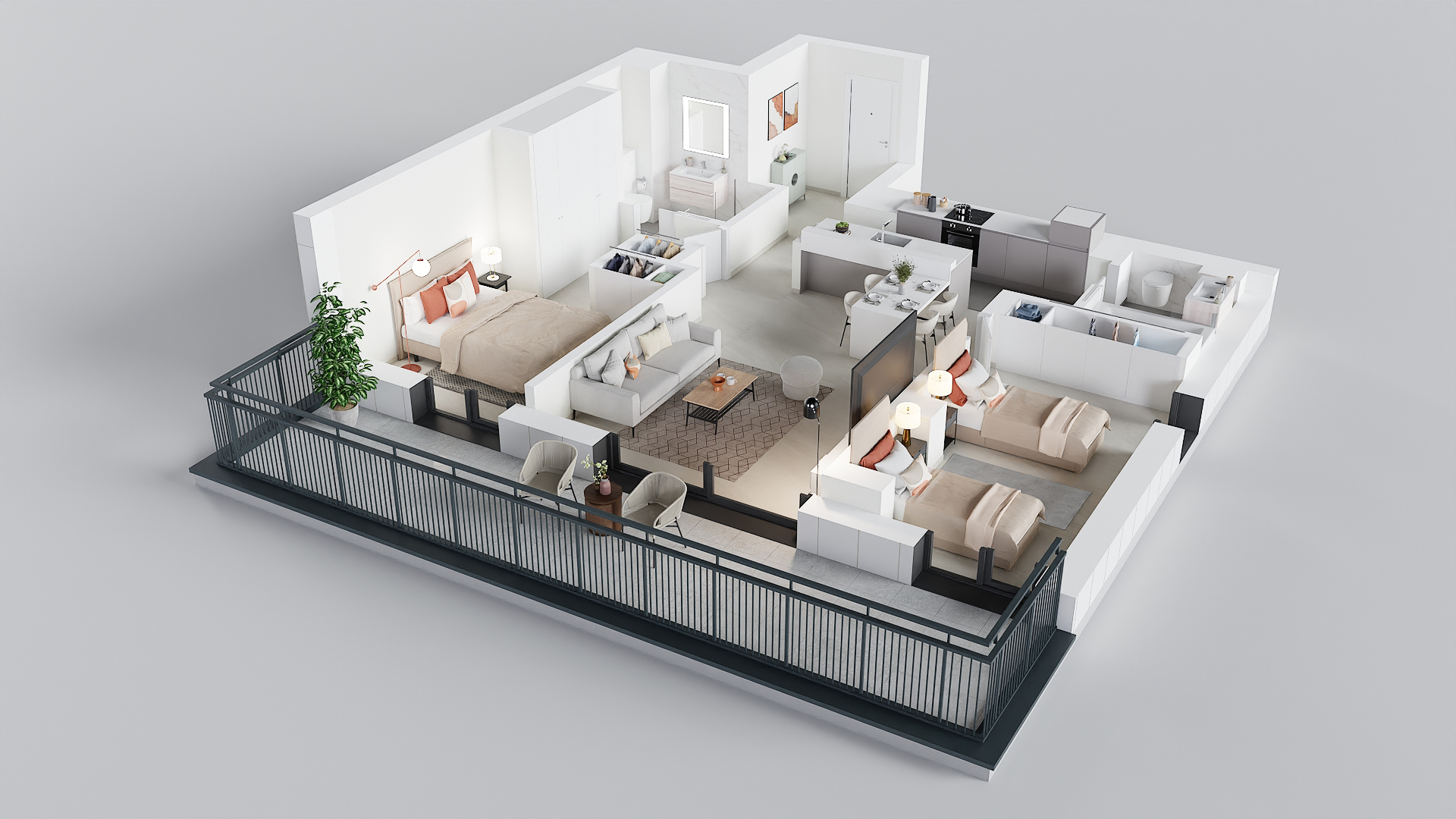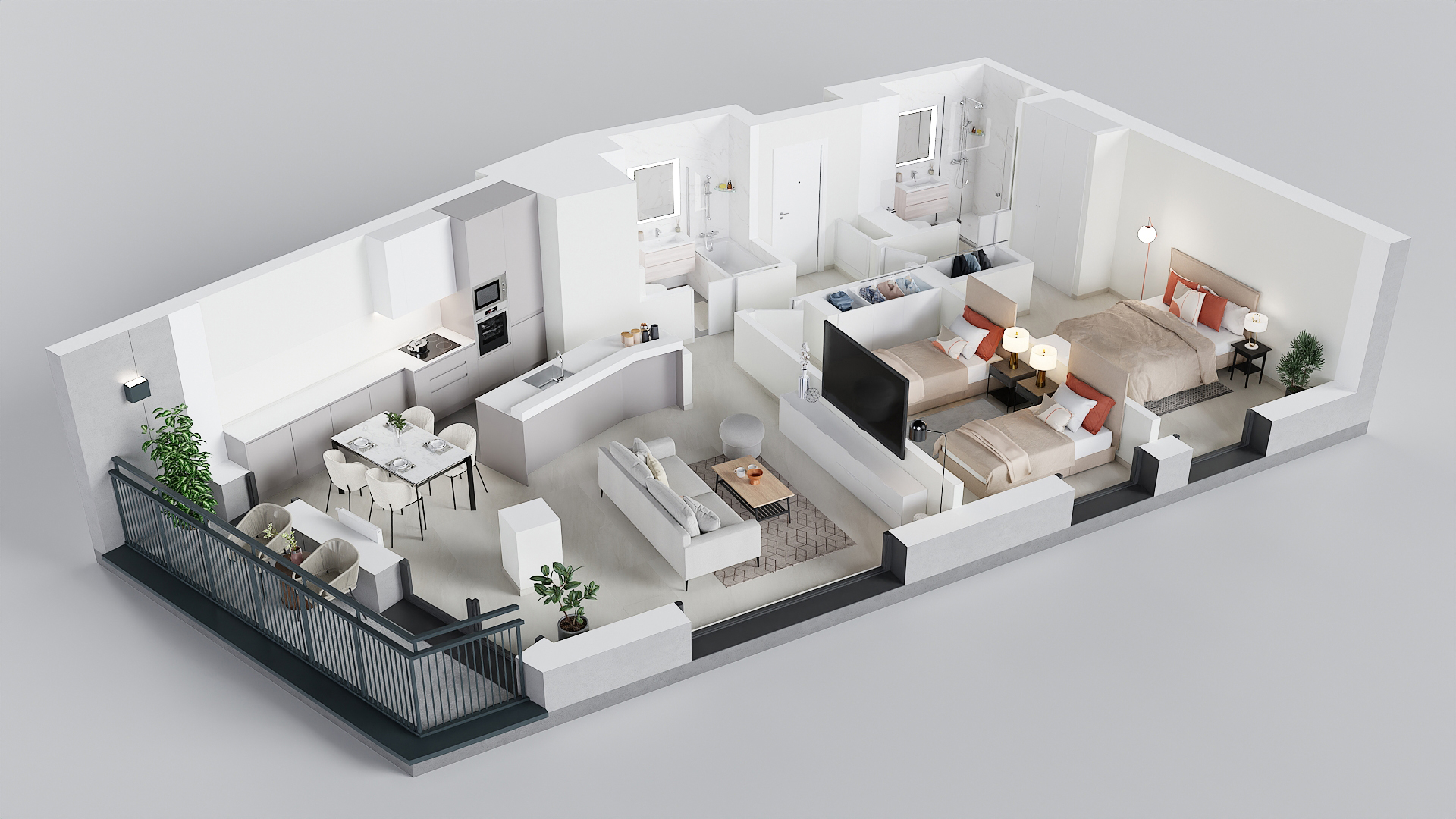 MADNUM Living cuenta con una variedad de viviendas con distintas tipologías y distribuciones, diseñados para adaptarse a tus necesidades. Disponemos de 70 viviendas con 2 dormitorios y 2 baños completos, con superficies que van desde 74 m² hasta 96 m². Estos espacios ofrecen amplitud y comodidad, ideales tanto para familias como para parejas.
